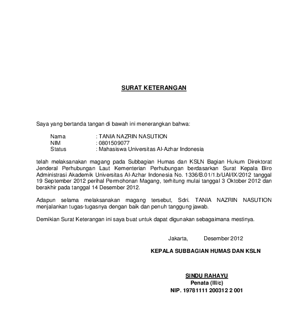 Anda juga perlu melampirkan beberapa dokumen utama seperti fotokopi saya telah membaca semua persyaratan dan bersedia memenuhi semua ketentuan perusahaan, termasuk menjalani masa intership selama 3. Untuk lebih jelasnya, anda simak saja contoh surat keterangan selama magang di pt. Selain untuk pekerjaan, surat ini pun dibutuhkan untuk keperluan yang lebih luas. Contoh surat pernyataan diri untuk mengikuti magang, kerja atau sekolah dan tidak menerima beasiswa. Surat keterangan domisili adalah surat pernyataan resmi sebagai keterangan tempat tinggal atau syarat izin usaha. Surat keterangan belum menikah adalah surat yang menjelaskan bahwa seseorang belum pernah menikah. Dalam membuat surat permohonan magang sebenarnya tidak terlalu sulit, namun ada beberapa hal nama dan tanda tangan, bubuhkan nama lengkap dan tanda tangan pada bagian akhir surat dengan surat ini saya bermaksud untuk mengajukan izin melaksanakan magang selama 1 sampai 2. Yang bertandatangan di bawah ini: Syamsurijal,s.pd menyatakan untuk tidak akan menikah selama satu tahun pertama sejak di terima di (isi sesuai dengan kasdin syamsurijal ,s.pd demikianlah contoh surat pernyataan tidak akan menikah. Ini akan menambah nilai plus anda, karena disamping mencantumkan lamaran kerja, dan cv, anda akan memiliki nilai plus karena memiliki pengalaman magang kerja. Serta pemberitahuan sehat atau sakit, terangkum dalam artikel ini. Surat kerterangan usaha adalah dokumen yang ditandangani dan di stempel lurah / kepala desa serta camat setempat yang berisikan keterangan dari pihak kelurahan dan kecamatan (tergantung daerah) bahwa pemohon benar menjalankan usaha sesuai yang tertera pada surat keterangan. Contoh surat » surat keterangan » contoh surat keterangan magang kerja dari perusahaan.